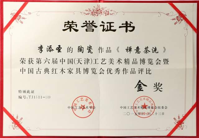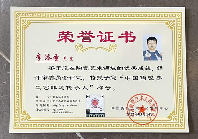 2022年3月14日,李添圣荣获中国陶瓷艺术文化发展中心授予“中国陶瓷手工艺非遗传承人”荣誉称号。