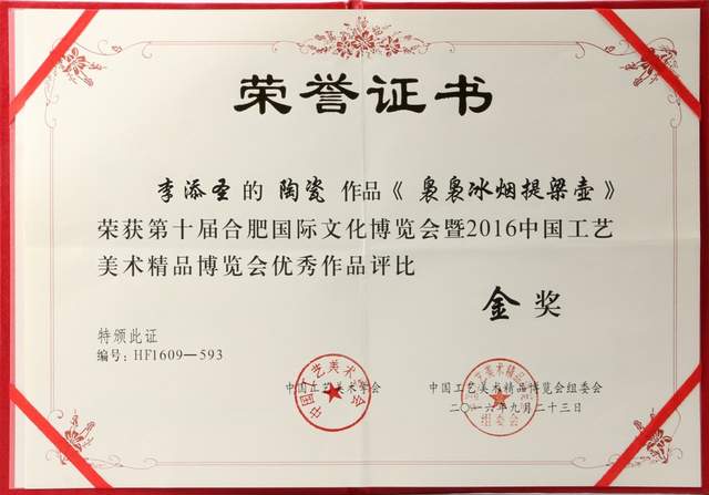 2016年,作品《袅袅冰烟提梁壶》,荣获第十届合肥国际文化博览会暨中国工艺美术精品博览会优秀作品评比金奖。