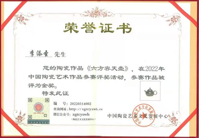 2022年,作品《六方容天壶》,荣获中国陶瓷艺术作品参赛评奖活动金奖。