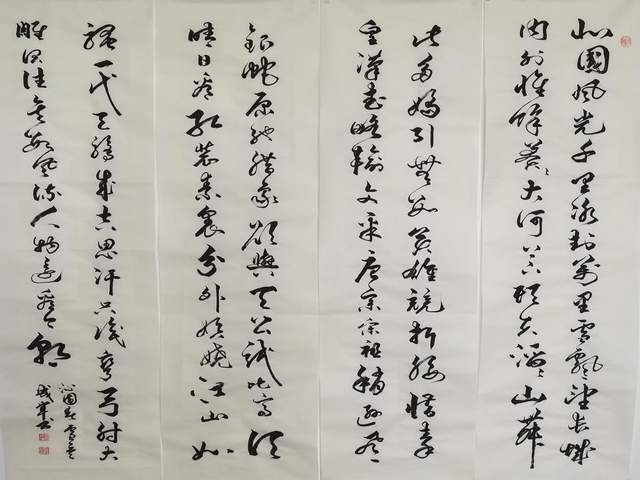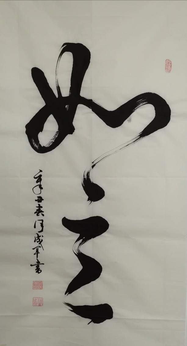 余成军说:“在不知道有没有际遇和不明白自己的天分的时候,不断的努力是成功的基本基石,在书法领域更是如此,通过长时间的临池训练,还要善于从自然万物中寻找灵感,打通笔法与自然万物的联系,方可达到“天人合一”极高境界。”