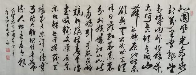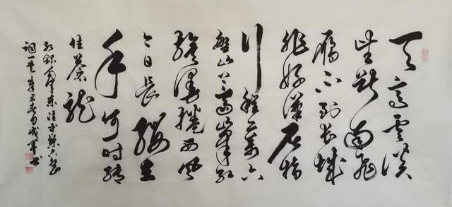翰墨写情,丹青传意。他的草书法线条如惊蛇出草,妙趣横生,其中的“使转”草书之美其实就在于信手即来,一气呵成,给人以痛快淋漓之感。“一笔书”,字与字上下牵动相连,笔意相连呼应,上字连下字起势,下字承上字笔意,形离而神合,如行云流水包罗万象。其笔法疾驰横枪竖戟,变化多变,笔势的回转勾连、舒卷相宜,逶迤连绵的浩荡气势。看似疏瘦,实则腴润,看似古淡,实则风华,盘郁顿挫,运笔都在空中,突然一落,偶然及纸,而字外功,笔间之意,不可群起端倪。
