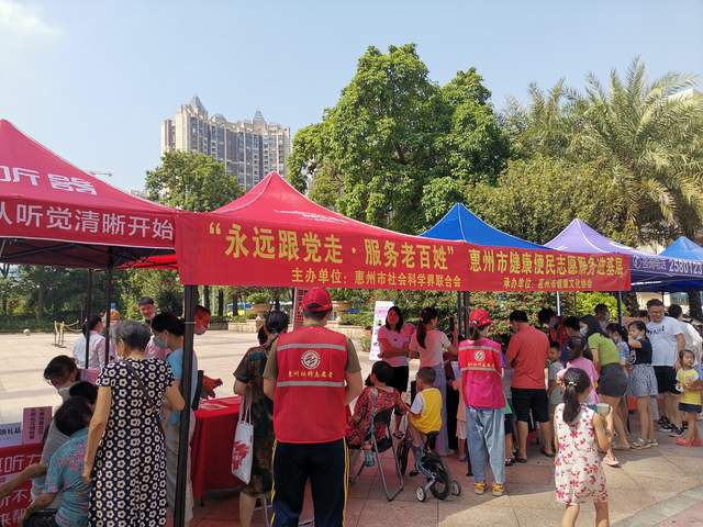 2022年8月28日上午,由惠州市社会科学界联合会主办、惠州市健康文化协会承办的主题为《“永远跟党走 · 服务老百姓” 惠州市健康便民志愿服务进基层》在广东省惠州市惠城区中洲天御2期西门广场圆满举办。志愿者及技术人员共计28人参加了本次志愿服务活动。惠州市健康文化协会执行会长张伟芳出席了本次活动并在现场指导工作。活动现场安排了听力检测、视力检测、口腔检查、测量血压、亲子游戏、美食品鉴、儿童手工绘画等多个健康便民服务活动,吸引了附近众多的群众前来参与。