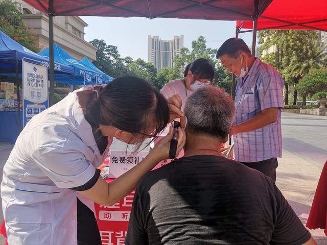 尽管天气炎热,但志愿者们热情高涨,穿上红马甲及专业服装在现场为前来参与活动的居民群众们进行热情服务。听力检测义诊摊位上排满了叔叔阿姨,志愿者杨影冰义诊师非常认真为叔叔阿姨做听力检测,有些叔叔阿姨估计是高度听力问题,需要大声喊才听得见或怎么喊也听不见,通过听力检测的仪器进行耐心检查,有相当一部分还是被筛查出来,志愿者义诊师通过多种方式与他们沟通,做一些简单护理,希望他们做进一步检查或到相关机构接受康复或治疗。