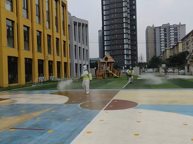 志愿者们身穿防护服、佩戴口罩,按比例配制消杀药品,严格按照消杀防疫规范操作专业消杀喷雾器,对教室、办公室、食堂、卫生间、楼道,户外园区等开展了全面喷洒消毒,实现了消毒消杀全覆盖,不留死角,力求将防疫工作做到最好,确保消毒彻底,达到有效防疫目的。