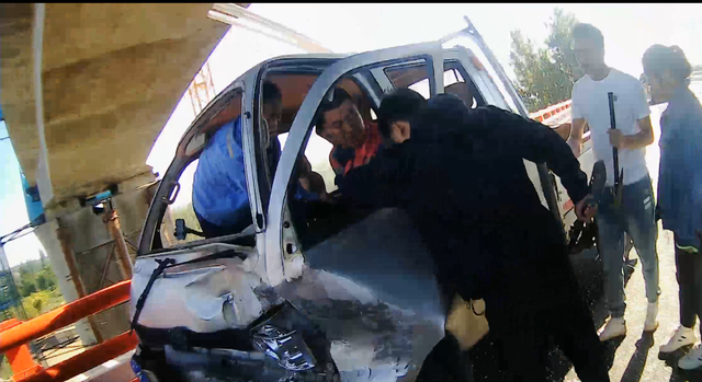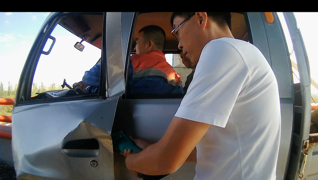 陈太平除了是宁夏太平机械租赁有限公司总经理,还有一个身份是中华志愿者协会应急救援委员会宁夏救援总队队长。此时看到被困人员在车里发出呼救,陈太平从车里取出专业设备切割机·撬棍·榔头等工具撬开车门营救伤员。从现场情况判断,驾驶员操作台撞击后内线将伤者腿卡在座椅上,车头和左侧车门损坏严重。询问伤者伤势后,沉着冷静专业素养的陈太平站在车头拿起撬棍撬开车门,对车内人员展开救援,半个小时后消防员和医护人员抵达现场,车内驾驶员成功救出,医护人员将伤员抬到担架上前往医院治疗。