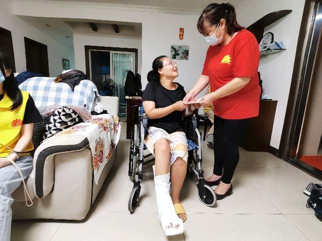 肖岩是惠州市向阳慈善会一名优秀志愿者,也是惠州向阳第一公益活动工作站站长,疫情防控、文明城市宣传、卫生保洁......不管是烈日还是骤雨,她都坚持参加公益,奉献自己。然而,天有不测风云。不久她在外出途中不幸发生意外,导致全身大面积擦伤,右脚严重骨折,经历了二次大手术。得知此事后,惠州向阳慈善会执行会长王云第一时间代表慈善会对她进行探望慰问。在中秋节当天,王云再次带领志愿者探访肖岩,送上慰问金和慰问品,关心她的受伤状况及恢复进度,嘱咐她安心休养,争取早日康复,回归到志愿者队伍中来。