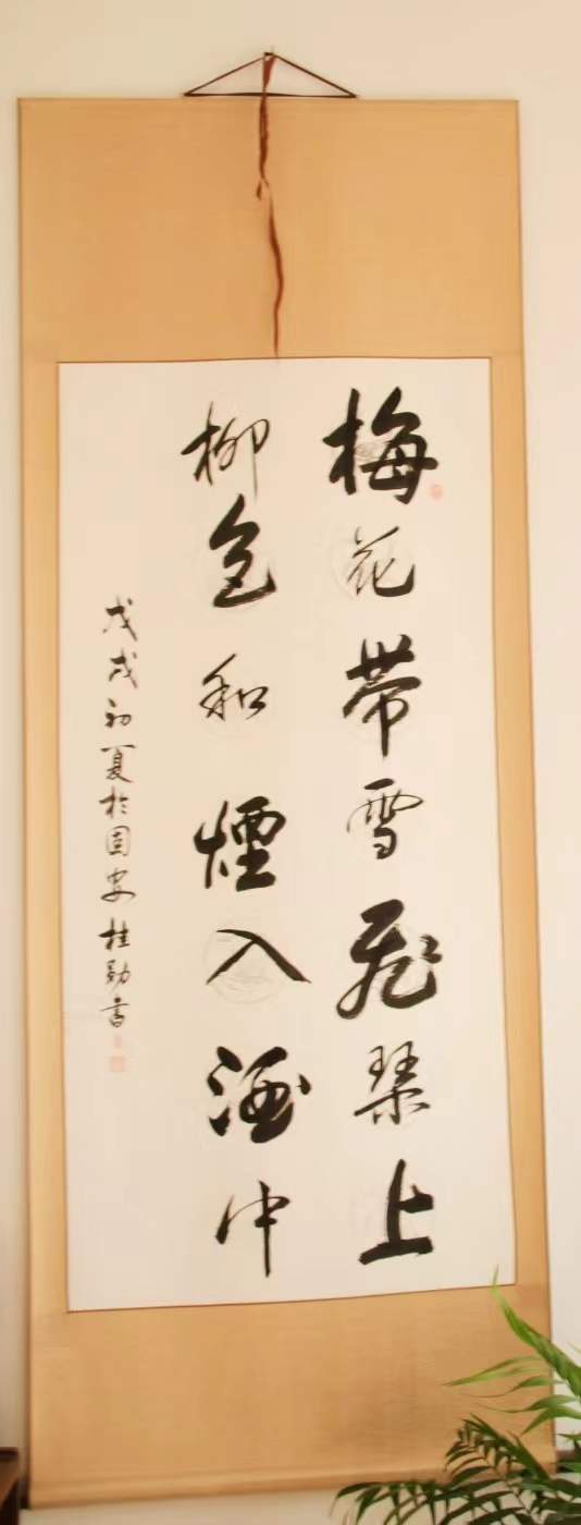 二十世纪初,蒋老师退休后离开了恋恋不舍的三尺讲台和心爱的学生们。回到家乡后,一刻也没有闲下来,对书法感兴趣的蒋老师一直在研究和学习行书书法写作,找一些志同道合的朋友一起交流学习。蒋老师之所以酷爱行书,是他从少年起受其父亲蒋有泉和小学恩师卢世源的影响,蒙上了写好中国字的决心。一有时间抄起毛笔伏案行书习作,不仅仅在内容上十分严谨,在字体上也是一丝不苟,苍劲有力。近年来,蒋老师的毛笔字在当地很有名气,整体上大气磅礴,洒脱飘逸,还透着一种文人的那种率性,让人耳目一新。多次应邀参加雄安新区及高碑店等地举办的“笔墨丹青 翰墨飘香”笔会交流活动,其书法作品笔笔惊艳,字字入法,如云行流水,秾纤间出,非真非草,离方遁圆,形成气韵撼人之势。