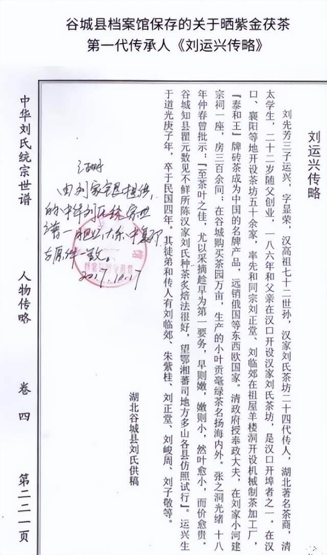 清同治元年(1862年)晒紫金茯茶第一代传承人刘运兴,正式确定晒紫金茯茶名称和初始制作技艺。