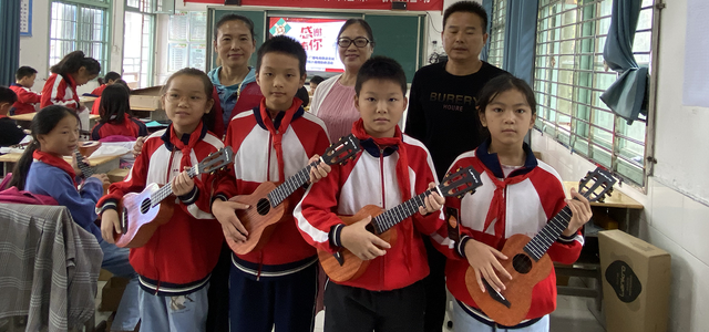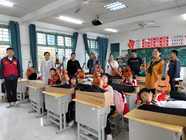 一走进学校大门,迎来了学生们一阵阵欢呼的声音,因天空下着雨,学子们争先恐后、齐心协力将捐赠的乐器搬进教室内,当30把崭新新的类似吉他的音乐器材取出来,教室内瞬间成了一片欢乐的海洋。