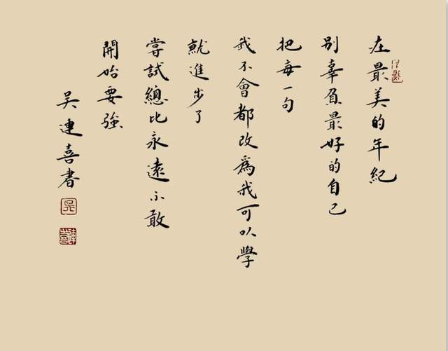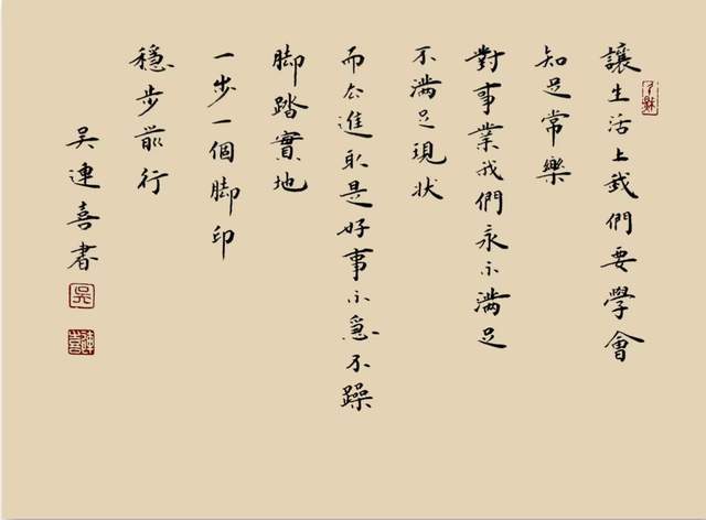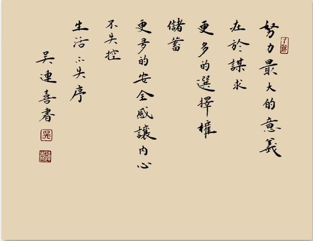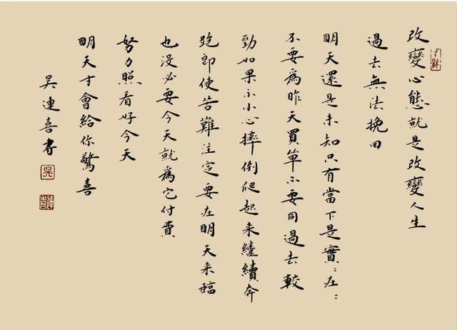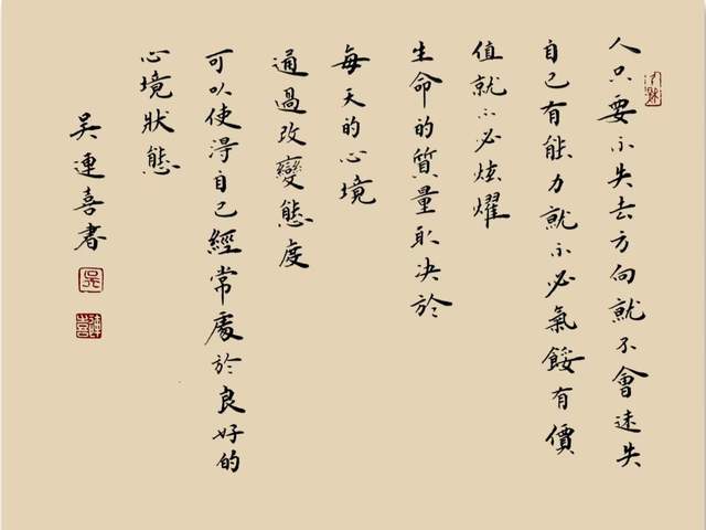 日前,书法家吴连喜先生创作了十帧书法作品,这些作品件件是充满正能量的励志语录。这些励志语录既能陶冶情操,又能传递真善美。真正做到了思想性、艺术性、观赏性的统一。