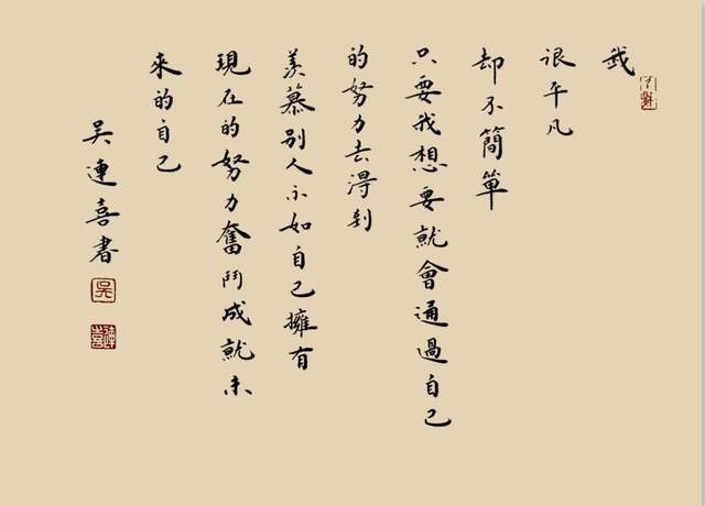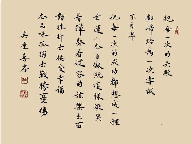 励志的人生,虽不能说做事一定会百分之百成功,但你的人生已经走在路上,人生要自己去拼搏、去奋斗,是一种鼓励,一种正确的引导!当代书法家吴连喜先生说。