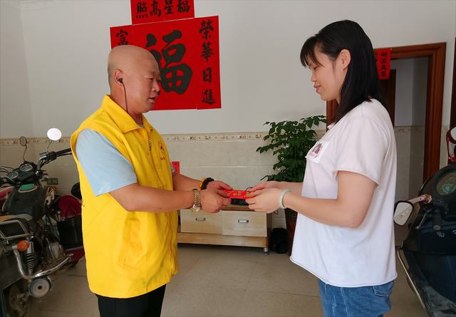 红棉慈善会优秀志愿者王庆峰给单亲妈妈廖艳媚送上慰问金。