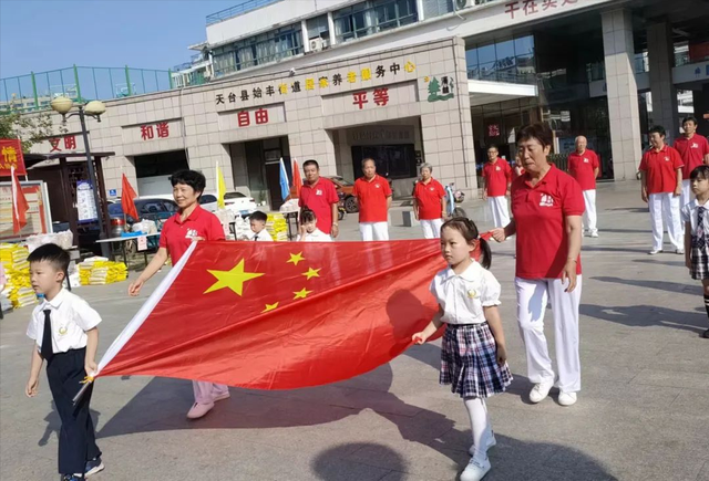 活动现场,孩子们和银龄护旗队的队员一起参加国庆升旗仪式。他们各个神采奕奕、精神抖擞,在庄严肃穆的国歌声中注视着国旗冉冉升起。