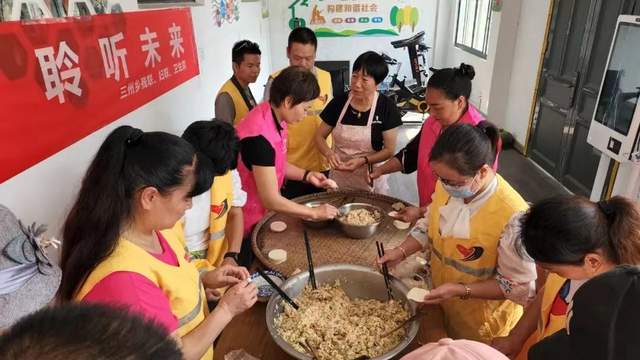 在三州雅园,志愿者们齐聚一堂,将韭菜、猪肉等食材以及面粉、佐料等摆上了桌子,一起动手包饺子。大家干劲十足,分工明确,不一会儿,一锅接一锅热气腾腾飘着香味的饺子端上了餐桌。老人们一边吃着热乎乎的饺子,一边聊着家长里短,好不高兴。