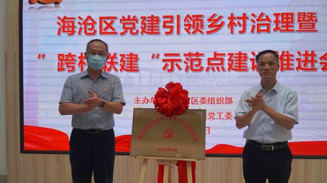 在推进会上,海沧区委组织部常务副部长、非公工委副书记叶伟民,海沧街道党工委书记李江平,为海沧区海沧街道跨村联建联合党委揭牌。
