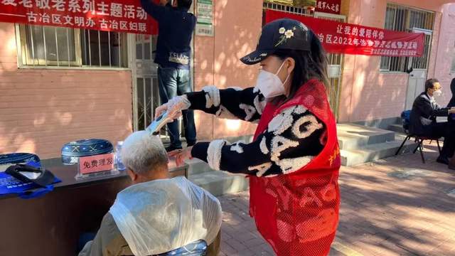 在免费理发志愿服务台,志愿者一丝不苟地为老人理发,动作娴熟,一气呵成。并耐心询问老人的需求,和他们亲切聊天,直到他们满意为止。理完发的老人们精神焕发,露出愉快的笑容。