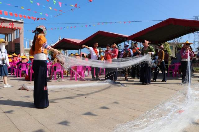 串完蚝壳后,惠女们又展示了她们另外的一门手艺,渔网制作。