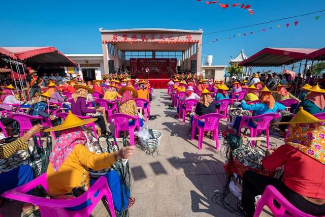 这场惠女渔具传统手工制作比赛活动,有两项内容,一是制作海蛎串壳,二是编织渔网,共有50名老少女性参赛。