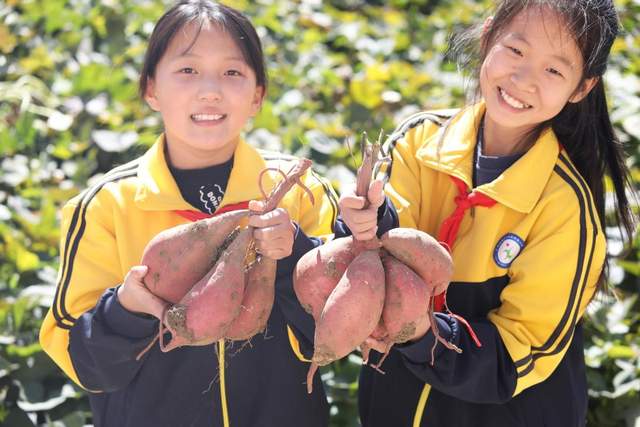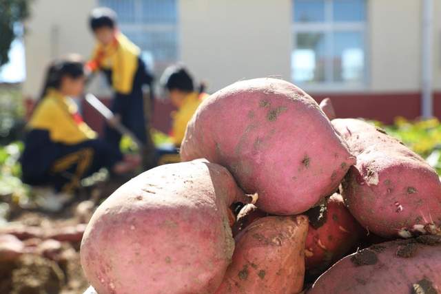 10月10日,唐山市丰润区新军屯镇溪歌庄小学的学生在校园收获红薯。