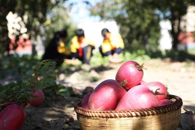 10月10日,唐山市丰润区新军屯镇溪歌庄小学的学生在校园收获萝卜。