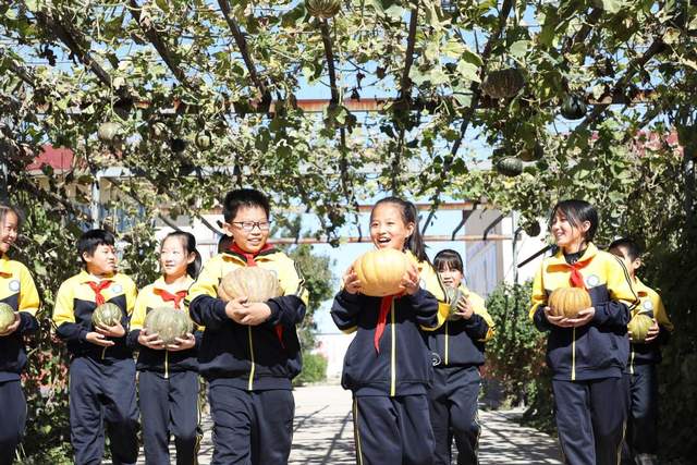10月10日,唐山市丰润区新军屯镇溪歌庄小学学生在校园搬运收获的南瓜。