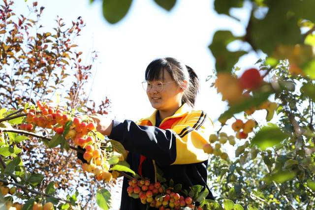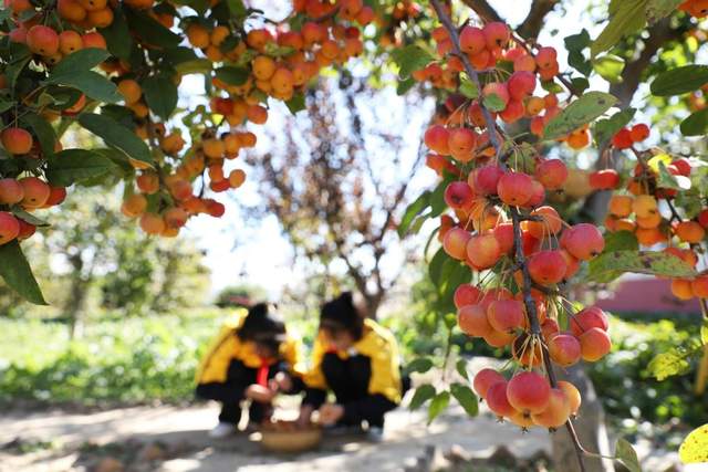 10月10日,唐山市丰润区新军屯镇溪歌庄小学的学生在校园采摘海棠果。