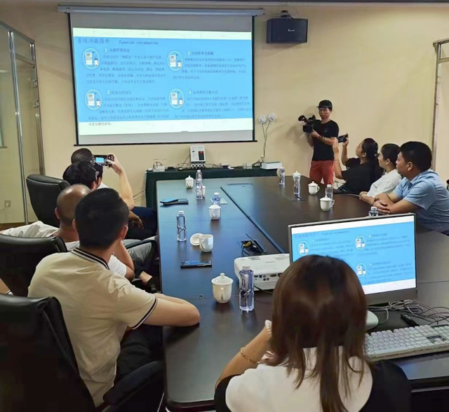当中国公益记录者在线德化工作站一行到达品为智能科技德化运营中心时,刚好碰到公司总经理张双垤与技术总监彭金锋正在巡查工作。当张双垤得知一行人的来意时,便亲自带着彭金锋以及其它部门人员,详细介绍了“物联连”系列产品的科研成果和优越特性。