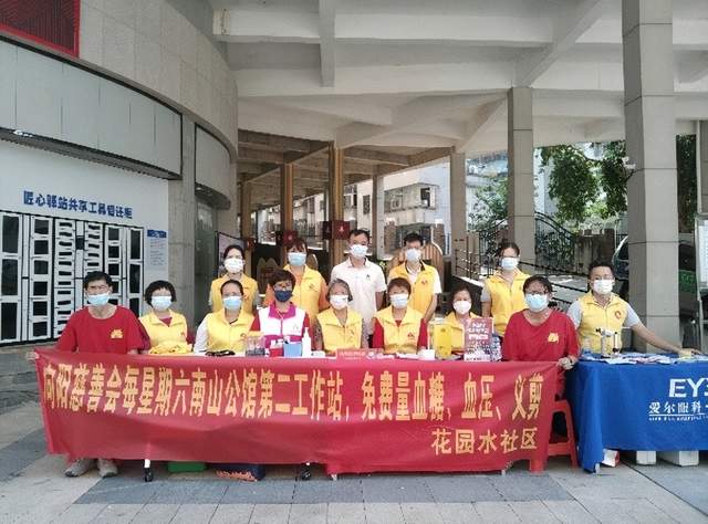 2022年9月17日上午,恵州市向阳慈善会在南山公馆社区举行“我为群众办实事”,爱心义剪和免费测量血压血糖,同时在花园水社区调动下,致美口腔和爱尔眼睛科也来到社区参与今天的活动。
